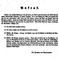Der Frankfurter Wachensturm am 3. April 1833 bildete bereits einen ersten Versuch von etwa 50 Studenten, eine gesamtdeutsche Revolution auszulösen. Die Aktion hatte sich gegen den Sitz des deutschen Bundestags gerichtet, der von den Demokraten als Instrument der Restaurationspolitik betrachtet wurde. Nach der Erstürmung der beiden Frankfurter Polizeiwachen wollten die Aufständischen die Gesandten der Fürsten im Bundestag gefangen nehmen und damit das Fanal zu einer gesamtdeutschen Erhebung setzen. Die Aktion, die schon im Vorfeld verraten worden war, scheiterte jedoch schon im Ansatz nach einem Schusswechsel, bei dem es einige Tote und Verletzte gegeben hatte.