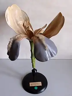 Die Blüten sind dreizählig: auf drei äußere nach unten gebogene, lange Blütenblätter („Hängeblätter“) folgen in den Lücken drei kürzere, sogenannte „Domblätter“, die aufrecht stehen und bogig nach innen weisen. Über die Bärte legen sich die Narbenlappen mit blütenblattähnlichen Ästen eng auf die „Hängeblätter“ geschmiegt, indem sie je ein fertiles Staubblatt in ihre Mitte nehmen. An der Basis dieses Komplexes wird Nektar abgeschieden. Jede Einzelblüte enthält drei solcher Komplexe, die von den Besuchern auch getrennt angeflogen und bestäubt werden. Dadurch wird auch jedes Samenfach des dreiteiligen Fruchtknotens getrennt befruchtet.