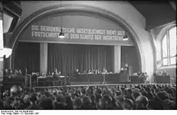 Unter der Regie der 1948 gebildeten Zentralen Kommission für Staatliche Kontrolle wurden 1950 in der DDR vier große politische Schauprozesse vor dem Obersten Gericht der DDR abgehalten. In diesen Prozessen der DDR-Justiz wurde extrem willkürlich verfahren, die Anschuldigungen waren in hohem Maße unglaubwürdig und die Urteile drakonisch.[12] Unter diesen stalinistischen Schauprozessen[13] war auch der Bernburger Prozess gegen ehemalige Direktoren und leitende Angestellte der Deutschen Solvay-Werke (DSW) wegen „Wirtschaftsspionage“, „Förderung der systematischen Misswirtschaft“ und der „Verheimlichung des Einflusses der IG-Farben-Industrie auf die DSW“.[14] Die parteiische[13] Anklageschrift wurde vom SED-Generalsekretär Walter Ulbricht, einem der deutschen Hauptakteure für Schauprozesse,[15] begutachtet und abgesegnet.[16] Die vorsitzende Richterin in dem Prozess der wirtschaftspolitischen Säuberungsjustiz[17] war Hilde Benjamin. Die Richterin und die Ankläger wurden durch Claqueure im Publikum unterstützt.[15] Die Verteidiger unterstützten mehr die Anklage, als ihre Mandanten zu verteidigen.[13] Die Angeklagten wurden zu langjährigen Zuchthausstrafen verurteilt, Otto Bökelmann in Abwesenheit zu 15 Jahren, Albert Werner zu zehn Jahren.