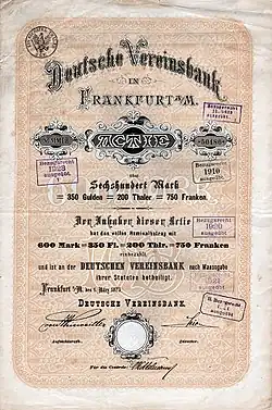 Die Deutsche Vereinsbank gab in den Jahren 1873 bis 1921 mehrere Aktienpakete in unterschiedlichen Stückelungen heraus. Beispielsweise 1873 eine 600 Mark Aktie mit einem rechnerischen Wert von 350 Gulden, 200 Thalern oder 750 Franken.[4]