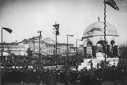 (Um dem Platz sind türkische und deutsche Flaggen als Zeichen der deutsch-türkischen Freundschaft zu sehen.)