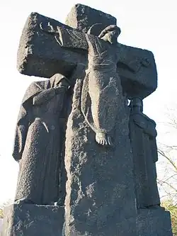 Der Zugang zum Friedhof erfolgt durch die Krypta. Auf der Krypta steht eine Kreuzigungsgruppe. Die einzelnen Figuren der Gruppe, Maria und Johannes, sind 3,30 m groß und wiegen jeweils sieben Tonnen. Im Innern der Krypta ist symbolisch die Statue eines Soldaten aufgebahrt, an der regelmäßig Kranzniederlegungen durch ausländische Staatsvertreter erfolgen.