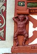 Bei der Wandbemalung sind im zweiten Obergeschoss die an den Hausecken in Nischen stehenden Personen als Christus und weibliche Allegorie des Glaubens zu deuten. Für die Renaissance typisch sind ebenso die Maskengesichter der Konsolen, die Pfostenschnitzereien und die bewehrten Atlanten in den Geschossbrüstungen, die wie aus Stein gemeißelt wirken.