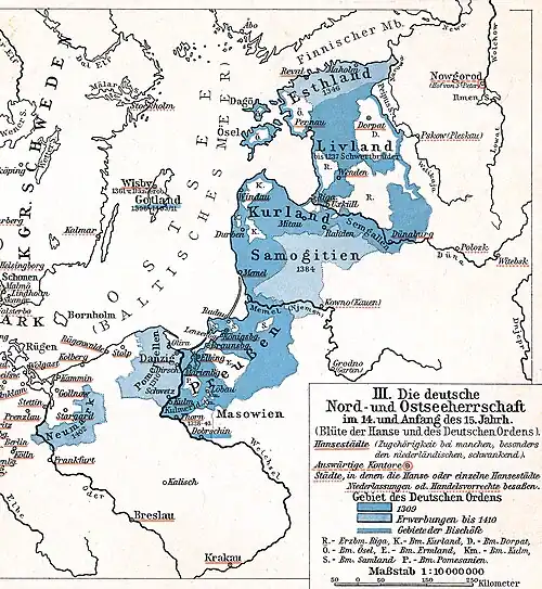 Seit 1202 hatte der Schwertbrüderorden im Auftrag des Bischofs von Riga Livland unterworfen, dem damals politisch auch das südlich des Rigaer Meerbusens gelegene Kurland zugerechnet wurde. 1237 schloss er sich aus Personalnot als Livländischer Orden dem Deutschen Orden an,[17] jedoch blieben das preußische Ordensland und Livland faktisch getrennte Herrschaftsgebiete.