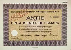 1930 erfolgte die Fusion der Motorenfabrik Deutz mit der Maschinenbauanstalt Humboldt AG, einem Hersteller von Lokomotiven aus Köln-Kalk, und der Motorenfabrik Oberursel AG zur Humboldt-Deutzmotoren AG. 1933 verließ die einzige Großdiesellokomotive das Werk. Die Humboldt-Deutzmotoren-Versuchslokomotive hatte eine Leistung von 1000 PS und verfügte über einen Direktantrieb, bei dem die Pleuel der drei Zylinder direkt auf die Treibachsen wirkten.[17] Obwohl die Lokomotive tauglich war, wurden keine weiteren Exemplare gebaut.[18] 1936 übernahm Humboldt-Deutz die kränkelnde Fahrzeugfabrik Magirus in Ulm. Die beiden Firmen ergänzten sich gut: Magirus produzierte Nutzfahrzeuge, benötigte jedoch dringend Dieselmotoren. Humboldt-Deutz fertigte Motoren, stellte jedoch selber keine kompletten Nutzfahrzeuge her. Die Fusion ermöglichte den Bau von vollständigen Lkw, Bussen und Feuerwehrfahrzeugen. Der Markenname lautete Magirus-Deutz. Das seit 1964 verwendete Logo des Unternehmens ist ursprünglich dasjenige von Magirus; ess zeigt ein großes „M“ für Magirus in Kombination mit der stilisierten Silhouette des Ulmer Münsters.