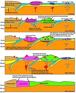 Zeitlich erfolgte die geologisch-tektonische Entwicklung innerhalb von ca. einer Milliarde Jahren mit zwei Hauptphasen des Krustenwachstums, die durch eine einige hundert Millionen Jahre lange Periode relativer Ruhe getrennt waren. In der ersten Phase zwischen 3400 und 3000 mya entwickelte sich der westliche Protokraton mit komatiitischem bis felsischem Vulkanismus und überwiegender Entwicklung von TTG-Komplexen, die das Grundgebirge der kontinentale Kruste aufbaute.