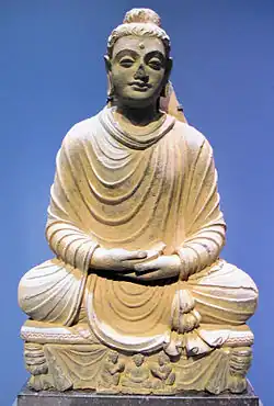 Zu den Handhaltungen (mudras) Buddhas gehört bereits in den frühesten Darstellungen seiner Person in der Gandhara-Kunst (1.–4. Jahrhundert) auch die Meditationshaltung (dhyanamudra), bei der die geöffneten und nach oben weisenden Handflächen im Schoß ineinandergelegt sind – die rechte Hand stets zuoberst. Diese Darstellungsweise wurde in der Jainistischen Kunst zur zentralen Ausdrucksform für die zumeist sitzenden Tirthankaras erhoben.