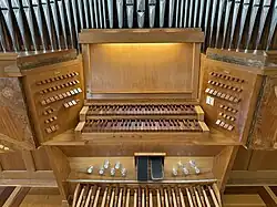 - Spielhilfen: Handregister («A») und zwei freie Kombinationen («B» und «C»). Einzelabsteller Zungenregister. Druckknöpfe unter dem I. Manual: Kombinationen A, B und C, Forte, Tutti. Pistons: Kombinationen A, B und C, Crescendo ab, Absteller Zungen, Absteller Mixturen. Zwei Balanciertritte (Registercrescendo und Schwellwerk).