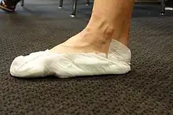 Der nicht abnehmbare Total Contact Cast gilt als Goldstandard der Versorgung von diabetischen Fußulzera.[28] Total Contact Casts, die aufgesägt werden und zum An- und Ablegen aus zwei Schalen bestehen, die mit einer einzelnen Gipsbinde oder mit Klettriemen befestigt werden, ermöglichen die Wundkontrolle und behindern den Betroffenen nicht bei der Körperpflege. Diese Casts werden mit einem sogenannten Verbands- oder Entlastungsschuh kombiniert, um es den Betroffenen zu ermöglichen, auf die Straße zu gehen, ohne den TCC zu schädigen. Hierbei ist auf einen entsprechenden Höhen-Ausgleich des anderen Beines zu achten, um einer unphysiologischen Laufbewegung, und somit Schmerzen in Hüfte und Knien vorzubeugen.
