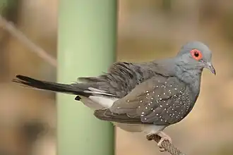 Das Diamanttäubchen oder auch die Diamanttaube (Geopelia cuneata) ist eine kleine, zierliche Taubenart. Sie gehört zur Fauna Australiens und kommt fast auf dem ganzen Kontinent vor; sie fehlt nur im Südwesten und -osten sowie in den Küstengebieten im Südosten von Queensland und New South Wales. Unter den australischen Taubenarten gilt sie als die Art, die sich in besonders hohem Maße an ein Leben in Trockengebieten angepasst hat.[1] Offene Wasserstellen müssen allerdings in wenigen Kilometern Entfernung zur Verfügung stehen.