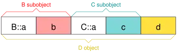 ![]() Die Klassen B und C haben jeweils ihre eigenen Kopien der Member der Oberklasse A und damit Zugriff auf zwei unterschiedliche Variablen a. |