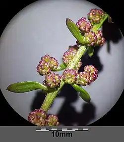 Der Blütenstand besteht aus knäueligen Teilblütenständen, die zu seitlichen verzweigten Scheinähren zusammentreten. Die Tragblätter sind länglich-lanzettlich bis linealisch und bis 1,5 cm lang. Die kahlen, grünen, fast kugeligen Blütenknäuel mit einem Durchmesser von 3 bis 4 mm bestehen aus einer endständigen zwittrigen Blüte mit vier bis fünf Blütenhüllblättern und ebenso vielen Staubblättern sowie seitlichen weiblichen Blüten. Die Blütenhüllblätter der seitlichen Blüten sind annähernd bis zur Spitze verwachsen und umschließen die Frucht sackartig. Oben enden sie in zwei bis vier ungleich großen, fleischigen, gewölbten Lappen (bis 0,5 mm Länge und 0,4 mm Breite), die auf dem Rücken deutlich gekielt sind. Der Fruchtknoten trägt zwei Narben.