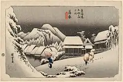 Die sechste annoncierte Serie war „Die 69 Stationen des Kisokaidō“ (Kisokaidō rokujūkyū-tsugi, 木曾街道六十九次), deren Umfang mit insgesamt 70 Blättern sogar noch den der Tōkaidō-Serie übertreffen sollte. In der Bildgestaltung ebenfalls identisch mit jener, sind auf den Drucken der Kisokaidō-Serie die Stationen des Kisokaidō, der Inlandsverbindung von Edo nach Kyōto, dargestellt. Die ersten 20 Drucke dieser Serie sind allerdings von Keisai Eisen gestaltet und wurden 1835/36 durch Takenouchi Magohachi veröffentlicht.[Anm. 4] Unter Beteiligung des Verlegers Iseiya Rihei erschienen um 1836 noch weitere vier von Eisen entworfene Drucke und erst danach war Hiroshige derjenige, der die restlichen 46 Drucke der Serie entwarf. Ende 1836 wiederum schied Takenouchi Magohachi, wahrscheinlich aus finanziellen Gründen, aus diesem Projekt aus, so dass 42 Drucke alleine von Iseya Rihei publiziert wurden. Der Erfolg beim Publikum war weit geringer als der der Tōkaidō-Serie, da der Kisokaidō weniger bereist wurde und der Markt für solche Drucke gesättigt war.[37]