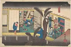 - 1835 in der von Takenouchi Magohachi produzierten Serie „Die 53 Stationen“ (Gojūsan tsugi no uchi, 五十三次之内). Die Blätter der Serie zeigen Schauspieler in Rollen aus dem im selben Jahr aufgeführten Kabuki-Stück „Die 53 Stationen während des Pflaumenfrühlings“ (Ume no haru gojūsan tsugi, 梅初春五十三駅). Sieben Drucke im ōban-Format sind bekannt und alle sieben haben ein kleines Kartuschenbild mit Abbildungen aus Hiroshiges Tōkaidō.[40]