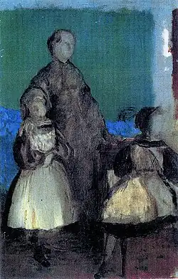 Die Mutter, Laure Bellelli, steht rechts im Gemälde hinter ihren Töchtern. Mit streng zusammengebundenen Haaren und in Schwarz gekleidet, scheint ihr Blick im linken Teil der Leinwand verloren zu sein. Wie von einem traurigen Gedanken erfüllt: Sie trauert um ihren verstorbenen Vater, dessen gezeichnetes Porträt gerahmt an der Wand hinter ihr hängt. Ihre Haltung hebt sich von den anderen im Werk dargestellten Personen ab: Sie ist körperlich anwesend, aber ihre Gedanken sind ganz woanders.