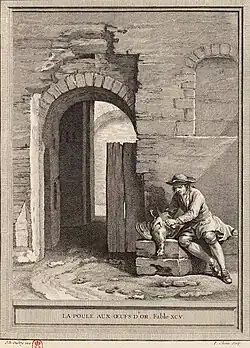 Die Henne mit den goldnen Eiern (französisch: La Poule aux œufs d'or) ist die 13. Fabel im fünften Buch der Fabelsammlung des französischen Dichters Jean de La Fontaine, die er 1668 zum ersten Mal veröffentlichte. Es ist die Geschichte eines Mannes, der eine Henne hat, die goldene Eier legt. Da er glaubt, sie hätte einen Tresor in ihrem Inneren, tötet er die Henne, um an den Schatz zu kommen, stellt dann aber fest, dass sie nur ein gewöhnliches Huhn war.[1] Der Glaube des Mannes hat dem Huhn den Tod gebracht, die Moral lautet: Manchmal ist es keine so gute Idee, alles zu ergründen.[2]