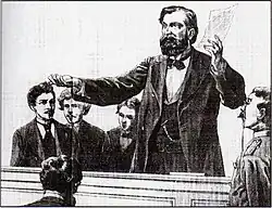 Treitschke übte großen Einfluss auf jene Generation von Studenten aus, die in der Endphase des Kaiserreichs und auch noch in der Weimarer Republik die Regierung und Verwaltung Deutschlands prägten. Der schwerhörige Treitschke, der seine Vorlesungen leidenschaftlich und laut vortrug (und aufgrund seiner fast völligen Taubheit keine Seminare abhielt und auch keine Schule bildete),[8] erfreute sich insbesondere bei Corpsstudenten größter Beliebtheit. Seine lebendig und mit rhetorischem Geschick vorgetragenen Vorlesungen waren häufig überfüllt, zogen auch Hörer außerhalb der Universität an und waren gesellschaftliche Ereignisse. Zu seinen Hörern und Studenten zählten viele prominente Persönlichkeiten und spätere Vertreter imperialistischer Strömungen im Deutschen Reich wie Alfred von Tirpitz, Friedrich von Bernhardi, Carl Peters und Heinrich Claß, aber auch Persönlichkeiten wie Friedrich Meinecke, Erich Marcks, Gustav Beckmann, Karl Liebknecht, W. E. B. Du Bois und Georg Simmel. Frauen ließ er zu seinen Vorlesungen nicht zu.[9] Als die Frauenrechtlerin Helene Stöcker ihn fragte, ob sie bei ihm hören dürfe, antwortete er: „Die deutschen Universitäten sind seit einem halben Jahrtausend für Männer bestimmt, und ich will nicht dazu helfen sie zu zerstören.“[10]