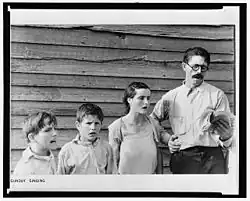 Ebenfalls lässt Schumann trotz der düsteren Handlung des Filmes verschiedene Kinderlieder zum Einsatz kommen, die einen Gegensatz zwischen dem „unbeschwert-Kindlichen und dem Verbrechen“ erzeugen würden. Dieser Gegensatz ziehe sich durch den gesamten Film.[43] Mehrmals singt Prediger Powell das 1887 geschriebene Kirchenlied Leaning on the Everlasting Arms im Film. Das Lied handelt vom Vertrauen auf Gott, da es aber der gefährliche Mörder Powell singt, wird der Text pervertiert. Als Powell das Kirchenlied erneut vor dem Haus von Mrs. Cooper anstimmt, singt diese kurzerhand mit, wodurch sie Powells boshafter Vereinnahmung des Glaubens ihr positives Gottvertrauen gegenüberstellt. Die ironische Verwendung von Gesangsliedern ist bereits in Grubbs Roman angedacht, in dem beispielsweise bei der Picknickszene Shall We Gather at the River? gesungen wird.[59]