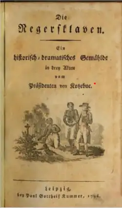- Die Negersklaven. Ein historisch-dramatisches Gemählde in drey Akten vom Präsidenten von Kotzebue. Wien: Joh. Bapt. Wallishauser. 1796. (Google Books Digitalisat)