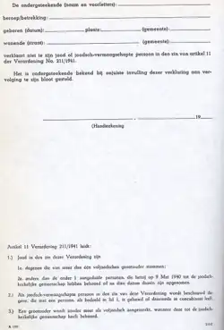 Der niederländische Oberste Gerichtshof stellte im verfassungsrechtlichen Prüfungsentscheid für die neuen, von den Besatzern erlassenen Gesetze fest, dass es ihm nicht zustehe, diese inhaltlich zu prüfen.[149] Erst im Mai 1943 präzisierte die Exilregierung ihre Anordnung aus dem Jahr 1937, nach der Beamte weiterhin ihren Dienst versehen sollten, dahingehend, dass dabei natürlich das zuvor bestehende Recht maßgeblich sei: „Die Verordnungen gegen die Juden entbehren demnach jeder Rechtsgrundlage“, eine Mitwirkung an den Maßnahmen sei untersagt.[150] Diese Anweisung kam allerdings für die meisten Juden in den Niederlanden zu spät. Die angesprochenen Beamten reagierten zum Teil empört, habe sich doch die Regierung nach England in Sicherheit gebracht und sei nicht imstande, die Lage vor Ort zu beurteilen.[151]