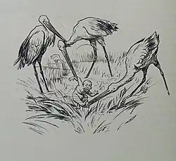 „Die immer noch lebendige Vorstellung, dass der Storch die Kinder bringe, könnte sich aus dem alten heidnischen Brauch entwickelt haben, bei Kinderlosigkeit Gewässergottheiten oder Feen um Nachwuchs zu bitten. Da der Storch ein Wasservogel ist und in Sümpfen oder flachen Seen herumstakt, übernahm er vielleicht im Zuge der Christianisierung diese Funktion. In jedem Fall zeigen die zahlreichen Kinderverse und Liedchen, wie tief die Überzeugung, er bringe die Babys, im Volk verwurzelt war.“[4]