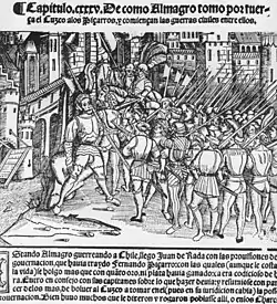 Am 15. April 1533 kam Almagro mit weiteren 200 Soldaten in Cajamarca an, wo Francisco Pizarro den Inkaherrscher Atahualpa gefangen hielt.[12] Atahualpa brachte mehrere Tonnen Gold und Silber als Lösegeld auf und wurde dennoch von Pizarro hingerichtet. Almagro wurde an der Verteilung des Lösegelds nicht beteiligt.[13] Luque war kurz vorher gestorben. Almagro und Pizarro eroberten Cusco im November des Jahres.