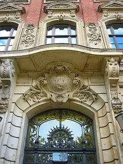 Vier leicht vortretende Wandpfeiler fassen das erste und zweite Obergeschoss zusammen. Die dazwischenliegenden drei Segmentbogenfenster des überhohen Sitzungssaales manifestieren durch die Sandsteinbrüstung und durch die von Konsolen getragenen Verdachungen – ein Segmentbogengiebel in der Mittelachse und Dreiecksgiebel außen mit einer Muschel im Giebelfeld – die Bedeutung des Sitzungssaales an der Fassade. Zwei beinahe bis zum Sturz der Fenster reichende hochrechteckige Sandsteinplatten mit je einem an den Einrollungen des Rahmens und einer daran hängenden Muschel befestigten Gehänge aus Bändern, Hermesstab, Flügelrad und Telegrafenstangen links und gekreuzten Lorbeerzweigen, Bändern, Zahnrad und Fliehkraftregler rechts, symbolisieren die Dienstabteilungen der Eisenbahndirektion. Das Zahnrad steht für die Werkstätten, der Fliehkraftregler für die Maschineninspektion, der Telegrafenmast naheliegend für die Telegrafeninspektion, das Flügelrad für die Betriebsinspektion und der Hermesstab für die Verkehrsinspektion. Drei Segmentbögen verbinden im nächsten Geschoss die Wandpfeiler. Drei dreiflügelige Fenster mit steinernen Fensterkreuzen folgen der Wölbung der Bögen und erhellen den Zeichensaal, der wegen des darunterliegenden überhohen Sitzungssaales über dem Niveau des zweiten Obergeschosses liegt. Über einem Sandsteinband folgen drei eng nebeneinander gereihte, kleinere Rechteckfenster und darüber ein ovales Giebelfenster. An der Spitze des Giebels zeigt eine Tafel das Jahr 1894.