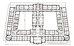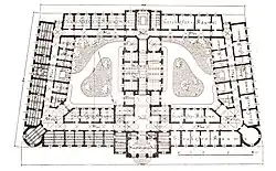 Die vornehmsten Geschäftsräume befanden sich im ersten Obergeschoss, dem auch mit seiner Geschosshöhe von 4,3 Metern ausgezeichneten Piano nobile. Die Geschosshöhe von 4,0 Metern im Erdgeschoss beziehungsweise 3,8 Metern im zweiten Obergeschoss empfanden Fachkollegen seinerzeit als zu gering. Die Deutsche Bauzeitung kritisierte in ihrem Bericht vom Rundgang der Mitglieder des Architektenvereins zu Berlin im Neubau am 20. Mai 1895 die aus Sparsamkeitsgründen auf ein sonst bei öffentlichen Gebäuden nicht übliches Mindestmaass herabgesetzte Geschosshöhe, welche die Innenräume etwas gedrückt erscheinen lasse.[5] In der Mitte des Mittelbaues, gut abgeschirmt im Inneren des Gebäudekomplexes lag die Hauptkasse der Direktion mit ihren beiden Tresoren. Der überhohe Sitzungssaal in der Mittelachse und das anstoßende Präsidentenzimmer im ersten Obergeschoss gestaltete Wegner der Bedeutung entsprechend aufwändig mit Gipsdecken und Wandgestaltungen im Stil der Neorenaissance. Für Beratungen mit den Dezernenten, deren Büros sich in den anschließenden Zimmern befanden, standen zwei Beratungszimmer in den Türmen zur Verfügung. Der gut beleuchtete Zeichensaal im dritten Geschoss über dem Sitzungszimmer gehörte wohl zur Bauabteilung der Direktion, dem Dienstbereich Wegners.