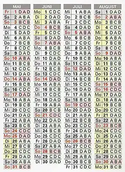 –– D (Früh) –– A (Spät) –– D (Nacht) –– A (Früh) –– B (Spät) –– A (Nacht) –– B (Früh) –– C (Spät) –– B (Nacht) –– C (Früh) –– D (Spät) –– C (Nacht) –– D (Früh) –– A (Spät) –– …