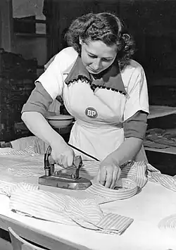 Büglerin in der Textil­fabrik Bierbaum-Proenen: Beispiel für einen Dienst­leister in einem Her­stellungs­betrieb