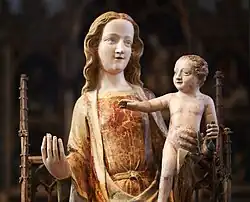 Ein in die Zeit um 1290 datierter Taufstein aus Basaltlava wurde in seinen vermauerten Bruchstücken im Abbruchmaterial der niedergelegten späteren Barockkirche gefunden und rekonstruiert. Dieser, und die sogenannte Dietkirchenmadonna aus dem 14. Jahrhundert sind überkommene Schätze. Sie zieren die heutige, von Heinrich Wiethase entworfene, im gotischen Stil erbaute Kirche.[17] Wann der Taufstein, der zeitweise auch als „Volksaltar“ diente, sowie die Skulptur der Madonna mit Kind in den Besitz der Pfarrkirche gelangten, ist derzeit nicht bekannt; sie werden aber später in die Dietkirche gekommen sein, da diese selbst zum Ende des 13. Jahrhunderts (Spendenaufruf durch Erzbischof Sifrid) und ebenfalls in den Anfängen des 14. Jahrhunderts auf Spenden für einen Neubau (der um 1316/17 im Bau war)[16] angewiesen war. Auch einer späteren Textpassage einer Einlassung von 1647 ist zu entnehmen, dass die Ausstattung des Kircheninneren recht dürftig gewesen sei. Auch die Gebäude des Konvents blieben in der oft von Durchzügen kriegerischer Banden betroffenen Stadt nicht von Schäden verschont. So berichtet eine Urkunde von 1320, dass die Äbtissin Ponzetta zu Dietkirchen – Schwester des Erzbischofs Heinrich II. von Virneburg – noch vor 1320 ein durch Brand/Brandstiftung vernichtetes Dormitorium in Dietkirchen für ca. 1000 Mark wieder aufbauen musste.[18] Nach den Kölner erzbischöflichen Regesten soll 1317 eine Krypta der Kirche existiert haben, die als ältester Teil des Bauwerks bezeichnet wurde.[19]