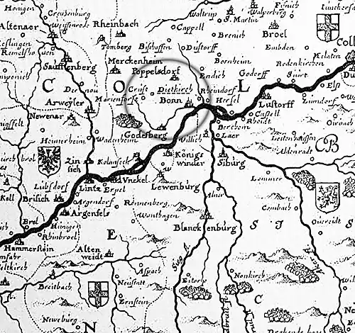 - ↑ Josef Dietz: Topographie der Stadt Bonn vom Mittelalter bis zum Ende der kurfürstlichen Zeit. mehrere Urkunden S. 215, Kurköln, Amt Bonn. Köln R. 1681.