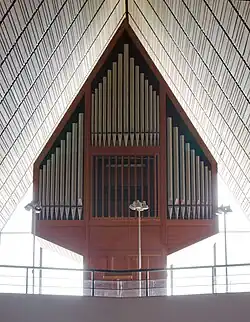 Der Innenraum ist von der dreieckigen Form des Daches bestimmt, das Hauptfenster und die Orgel nehmen diese Form auf und bilden die beiden das Kirchenschiff abschließenden Elemente.