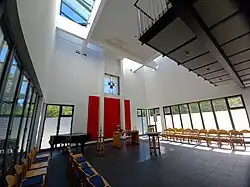 Kirche und Gemeindezentrum bilden jeweils einen Kubus, die über dem ebenfalls würfelförmigen Eingangsbereich der Kirche miteinander verschränkt sind. Die würfelförmige Anlage symbolisiert die Gerechtigkeit Gottes, die alle Menschen mit gleichem Maß misst. Die Kirche ruht auf 12 Grundsteinen, jede Glaswand ist durch zwölf Pfeiler unterteilt. Sie erinnern an die 12 Stämme Israels und an die 12 Jünger Jesu. Die Glasfenster sind mit Worten Dietrich Bonhoeffers gestaltet und sind von innen und außen lesbar. Manfred Mayerle schuf das Glasfenster am Turmfuß, das Altarkreuz, das Taufbecken, ein Lesepult, einen Kerzenständer für die Osterkerze und ein rotes Triptychon als Altarbild.[1]