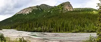 ![]() Dietrich River unmittelbar vor dem Zusammenfluss mit dem Bettles River, im Hintergrund der Sukakpak Mountain | ||