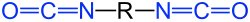 Allgemeine Struktur eines Diisocyanates. Die Isocyanat-Gruppen sind blau markiert, R ist ein zweibindiger organischer Rest (z. B. eine para-Phenylengruppe). |