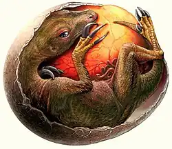 Eine Maiasaura-Nestkolonie, die Jack Horner im Jahr 1978 in Montana (USA) entdeckt hat, zeigt, dass einige Dinosaurier ihre Jungen noch lange nach dem Schlüpfen betreuten und beschützten.[50] In der Mongolei wurde 1993 das Skelett des Oviraptoriden Citipati in einer brütenden Position über seinen Eiern entdeckt; dies könnte auf isolierende Federn hinweisen, welche die Eier warm hielten.[51] Andere Funde zeigen ebenfalls elterliche Fürsorge. So wurde zum Beispiel in Liaoning (China) ein erwachsenes Exemplar des Ceratopsier Psittacosaurus zusammen mit 34 Jungtieren gefunden – die große Anzahl des Nachwuchses könnte darauf hindeuten, dass das erwachsene Tier den Nachwuchs von verschiedenen Individuen betreut hat, ähnlich wie bei heutigen Straußen.[52] Die Auca-Mahuevo-Fundstelle in Patagonien barg tausende Nester mit Eiern, die Sauropoden zugeschrieben werden und Hinweise auf große Nistkolonien dieser Dinosaurier geben, ähnlich denen der heutigen Pinguine. Sauropoden betrieben allerdings wahrscheinlich keine elterliche Fürsorge, was nicht zuletzt wegen der Größe der Elterntiere im Vergleich zu den Jungtieren angenommen wird.[53]