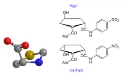 Hinsichtlich des kcat/KM-Wertes ist das Aze-Derivat vergleichbar mit dem entsprechenden Pro-Substrat. In dem einen Fall handelt es sich um einen Fünf- im anderen Fall um einen Vierring. Ebenfalls interessant war die Prüfung der Verbindungen Ala-Xaa1-pNA mit Xaa1 = a-5MeOxa, und s-5MeOxa. Ala-(s-5MeOxa)-pNA fungierte als Substrat, Ala-(a-5MeOxa)-pNA nicht [s = syn, a = anti]. Der Prolinring ist nicht planar gebaut, sondern liegt in einer Konfiguration analog dem Schema 2 (links) vor.