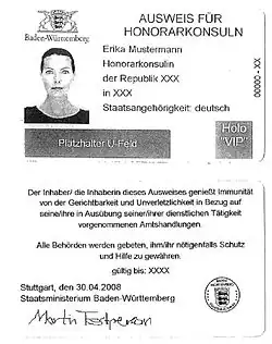 - ↑ Aktualisierung der Muster der besonderen Ausweise. In: Amtsblatt der Europäischen Union. C, Nr. 153, 6. Juli 2007, S. 15–20, abgerufen am 26. Dezember 2012.