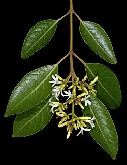 Die Frucht ist aus zwei länglichen Balgfrüchten zusammengesetzt, die außen dunkelbraun und mit vielen blasseren Lentizellen gesprenkelt sind und sich auf der adaxialen Seite öffnen. Die Samen sind seitlich zusammengedrückt, länglich und an der Spitze mit langen Flügeln versehen. Die Flügel der zwei äußeren Samen sind zur Basis gerichtet, die der zwei mittleren Samen zur Fruchtspitze.