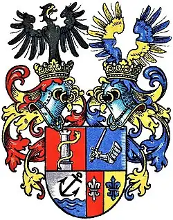 Blasonierung im Wappenbuch des Westfälischen Adels: Quadriert. Feld 1 in Rot eine silberne von einer goldenen Schlange umwundene goldgekrönte Säule. Feld 2 in Blau ein silberner Schwertarm. Feld 3 in Silber ein auf blauen Wellen schräglinks liegender silberner Anker. Feld 4 gespalten: rechts in Rot eine goldene Lilie, links in Gold eine blaue Lilie. Zwei gekrönte Helme: I. wachsender schwarzer Adler. II. ein offener Flug, Gold und Blau übereck geteilt. Die Helmdecken sind rot-golden und blau-golden.[7]