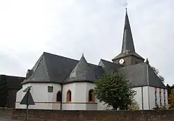 Die Außenmauern der Kirche, die aus Feldsteinen, Bruchstein und römischem Fundmaterial bestehen, sind bis zu einer Höhe von fast vier Metern zum größten Teil aus den Resten des ursprünglichen Bauwerks, einer im 11. Jahrhundert errichteten romanischen Saalkirche mit eingezogenem quadratischem Chor gebildet.[46] Sie war eine Filiale der Lechenicher Pfarrkirche St. Kilian und dem Stift St. Aposteln in Köln inkorporiert. 1758 wurde Dirmerzheim eine eigene Pfarre.[47][48]