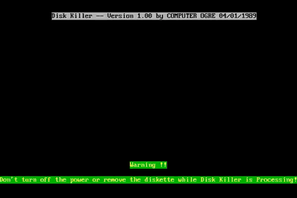Disk Killer -- Version 1.00 by COMPUTER OGRE 04/01/1989