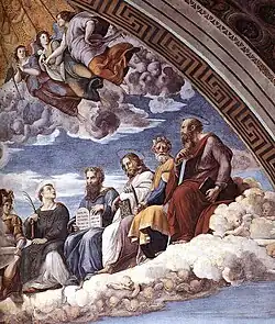 Die Geisteswelt der Stanza della Segnatura entspricht derjenigen anderer zeitgenössischer Schriften und Bilder, doch dürfte Raffael für die bis ins Detail durchdachte Gestaltung seiner Fresken Berater gehabt haben. Neuerdings wird Aegidius de Viterbo als direkte oder indirekte Inspirationsquelle angenommen.[6]