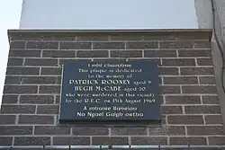 Bei den Unruhen im August 1969, die durch den Einsatz der britischen Armee beendet wurden, brannte ein aus dem Gebiet der Shankill Road kommender loyalistischer Mob Häuser in der Umgebung der Divis Flats nieder. Die überwiegend aus Protestanten bestehende und von Katholiken meist als parteiisch angesehene nordirische Polizei Royal Ulster Constabulary (RUC) beschoss die Divis Flats mit Browning-Maschinengewehren. Hierbei wurden zwei Menschen getötet, darunter der neunjährige Patrick Rooney. Der Scarman Report, eine von der nordirischen Regierung beauftragte Untersuchung der Unruhen, nannte den Einsatz der Maschinengewehre „gänzlich ungerechtfertigt“. Der Scarman Report machte die IRA für Schüsse verantwortlich, die vom Dach der Grundschule in den Divis Flats aus auf die Menschenmenge abgegeben wurden. Dabei wurde ein Mensch getötet und weitere verletzt.[26]