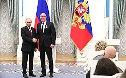 Dmitri Nikolajewitsch Tschernyschenko (russisch Дмитрий Николаевич Чернышенко; geboren am 20. September 1968 in Saratow, Sowjetunion) ist ein russischer Geschäftsmann und Politiker, Mitglied des Vorstands der russischen Eisenbahnen und seit Dezember 2014 Vorstandsvorsitzender von Gazprom-Media. Von 2020 bis 2021 war er Mitglied des Aufsichtsrats der Sberbank of Russia.[1] Seit 2020 ist er stellvertretender Ministerpräsident Russlands für Tourismus, Sport, Kultur und Kommunikation.
