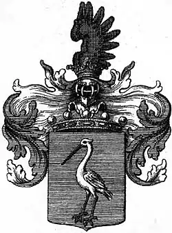 Das Stammwappen zeigt einen weißen Storch auf blauem Grund. Laut Legende geriet der Stammvater des Geschlechtes in türkische Gefangenschaft. Ein Storch, der im Sommer nach Norden zog, soll ihm den Weg zurück in die Heimat gezeigt haben.[4]