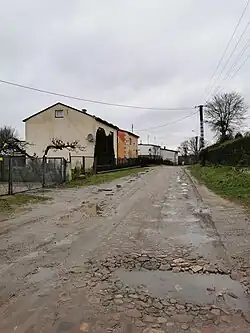 Der Ort liegt an einer nebengeordneten Straße, die Dębnica Kaszubska (Rathsdamnitz) an der Woiwodschaftsstraße 210 mit Czarna Dąbrówka (Schwarz Damerkow) an der Woiwodschaftsstraße 211 verbindet.