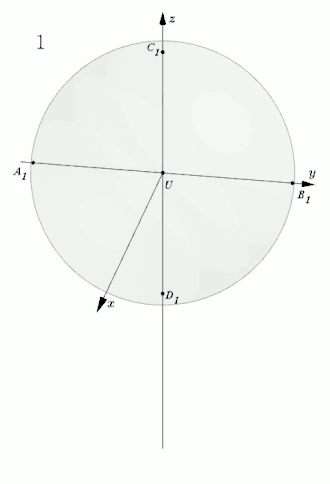 Gegeben sei eine Umkugel, z. B mit dem Radius gleich und deren Mittelpunkt . Beim Bestimmen der und Achsen eines kartesischen Koordinatensystems, entstehen die Punkte und auf der Oberfläche der Umkugel.