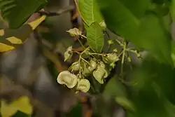 Die kleine, häutige, zwei- bis vierfächerige, zuerst rötliche und mehrsamige Kapselfrucht ist mit einer Länge von 1,2 bis 1,4 cm sowie einem Durchmesser von 1,5 bis 2 cm leicht aufgeblasen[4] und reift manchmal ab November,[5] oft von Januar bis März und färbt sich dabei hell- bis kastanienbraun. Die Kapselfrucht besitzt meist drei oder vier, manchmal zwei papierartige Flügel, die bis zu 1 cm breit sind. Eine Kapselfrucht enthält bis zwei Samen pro Fach. Die etwa 3 mm langen, ellipsoiden bis fast kugeligen Samen sind schwarz.